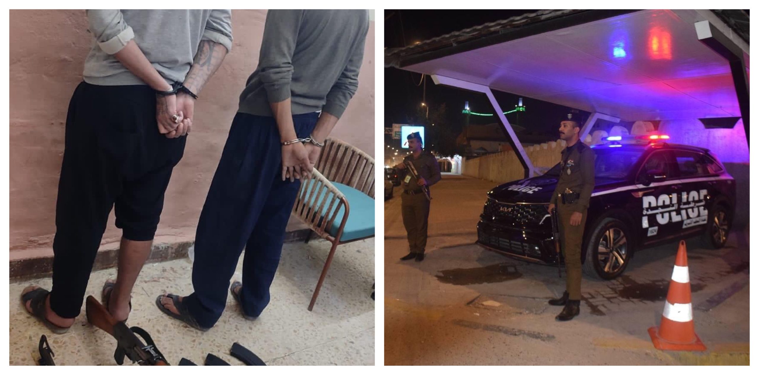 و اضاف البيان من انه تم اختيار مجموعة من ضباط ومنتسبي النجدة تم نصب الكمائن وتسسير الدوريات و التمكن من القاء القبض على المتهمين وضبط بحوزتهم بندقية اكلاشنكوف وبندقية اربي كي مع عتاد .