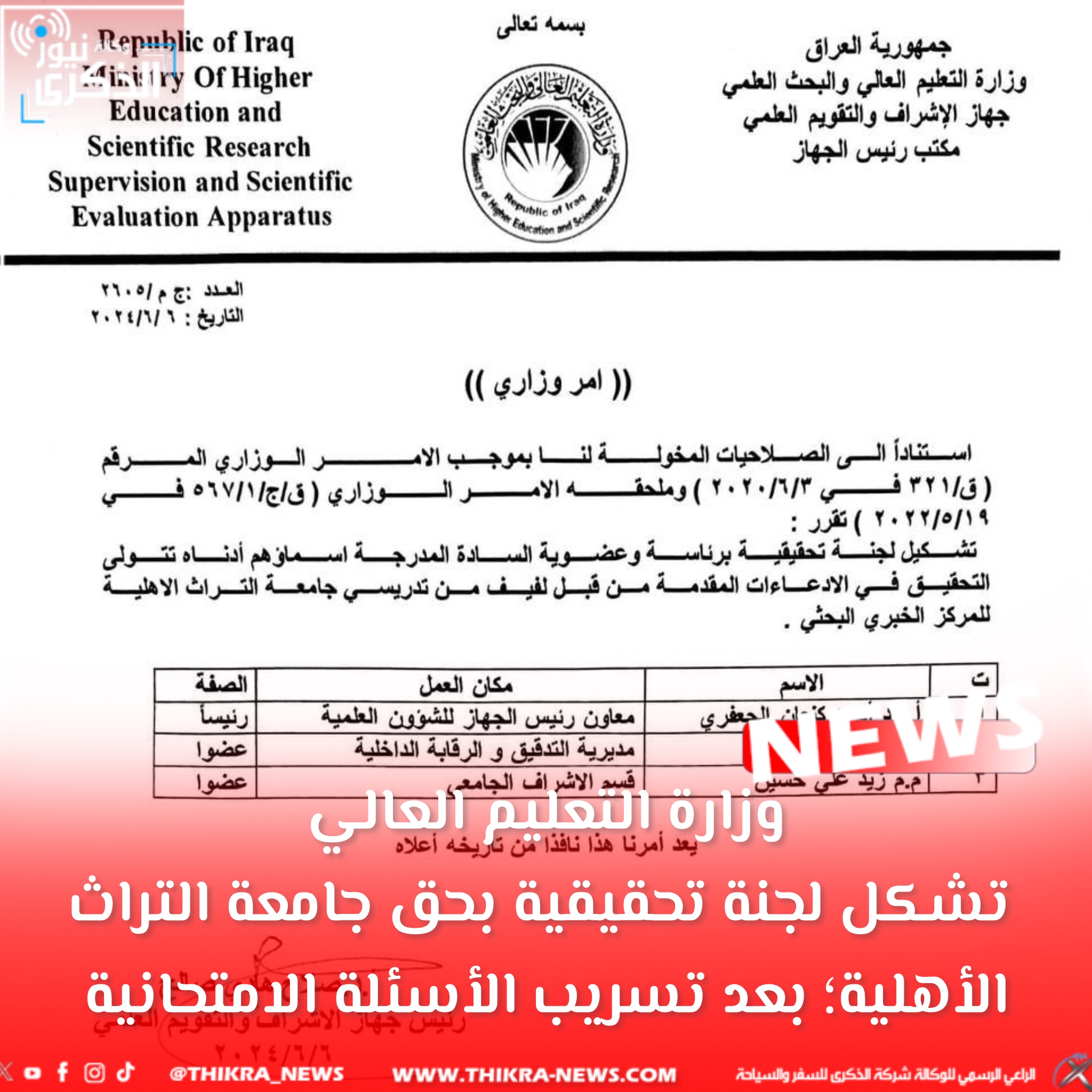 وزارة التعليم العالي تشكل لجنة تحقيقية بحق جامعة التراث الأهلية؛ بعد تسريب الأسئلة الامتحانية