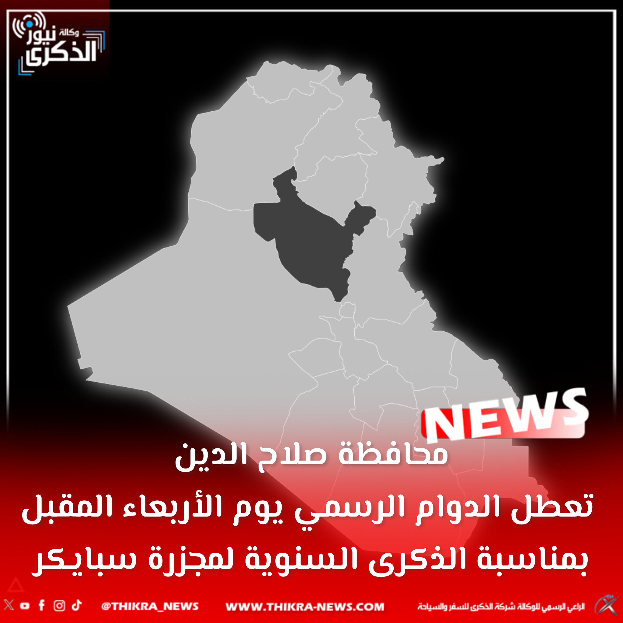 محافظة صلاح الدين تعطل الدوام الرسمي يوم الأربعاء المقبل بمناسبة الذكرى السنوية لمجزرة سبايكر