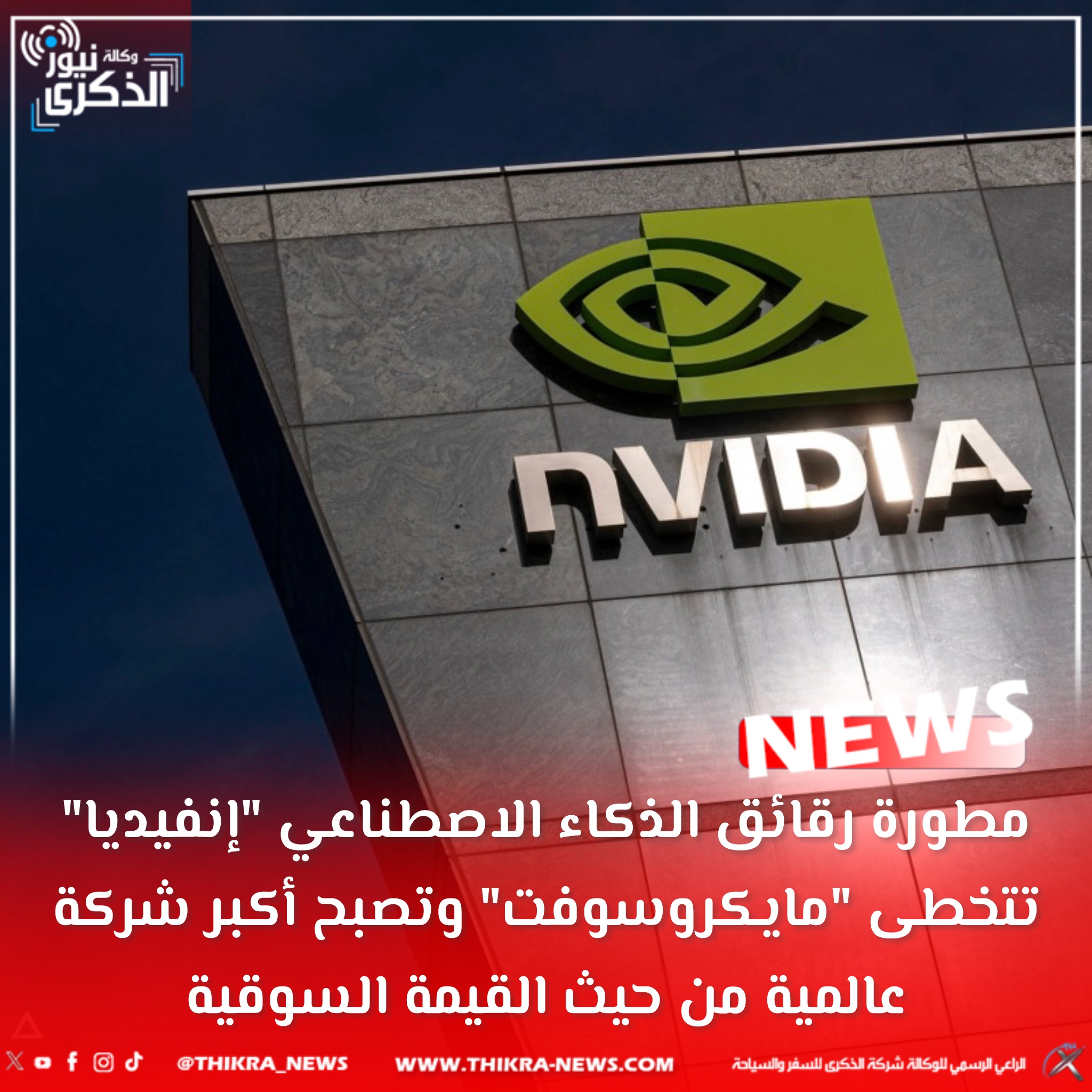 مطورة رقائق الذكاء الاصطناعي “إنفيديا” تتخطى “مايكروسوفت” وتصبح أكبر شركة عالمية من حيث القيمة السوقية