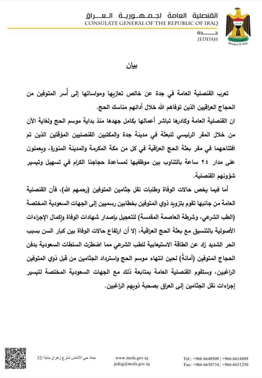 القنصلية العراقية في السعودية تصدر بيانا حول المتوفين من حجاج العراق