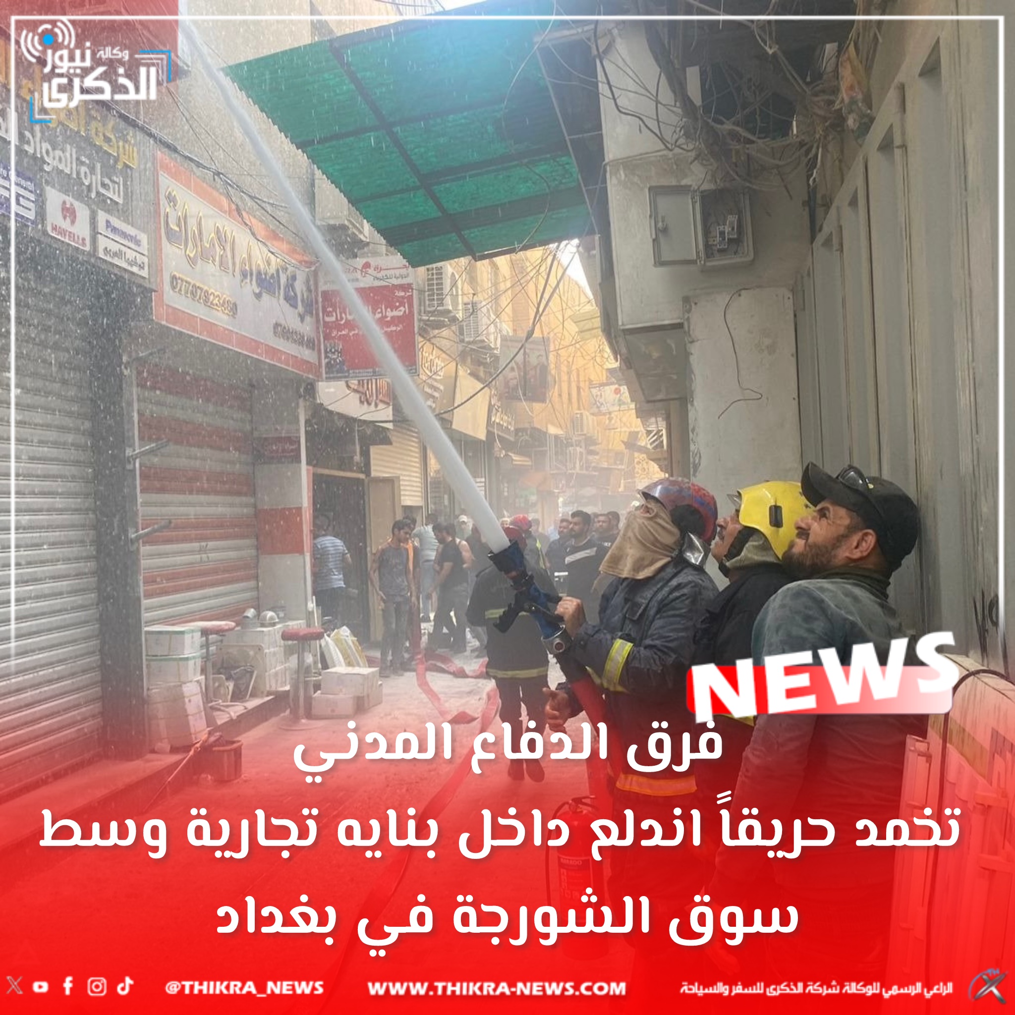 فرق الدفاع المدني تخمد حريقاً اندلع داخل بنايه تجارية وسط سوق الشورجة في بغداد