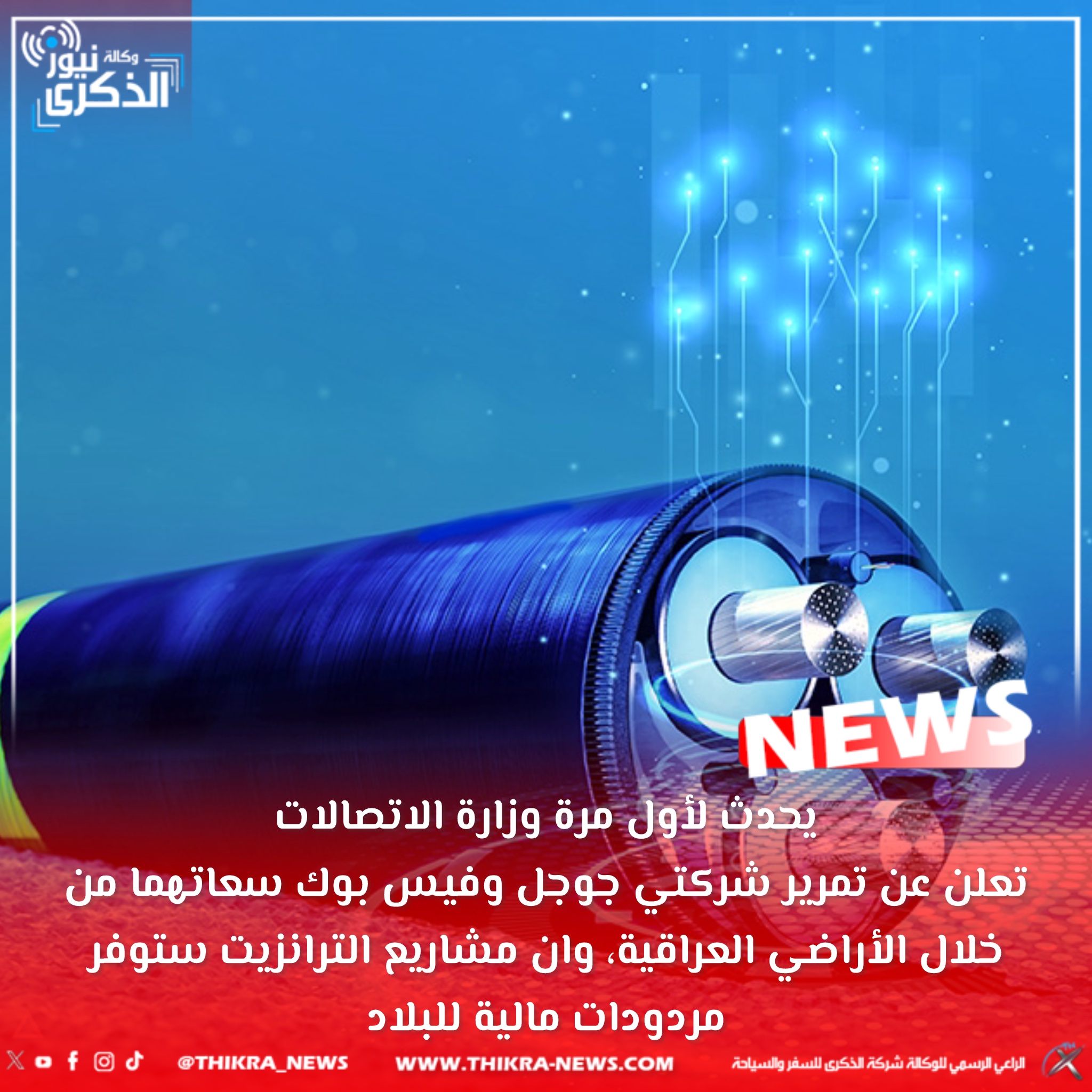 يحدث لأول مرة وزارة الاتصالات تعلن عن تمرير شركتي جوجل وفيس بوك سعاتهما من خلال الأراضي العراقية، وان مشاريع الترانزيت ستوفر مردودات مالية للبلاد