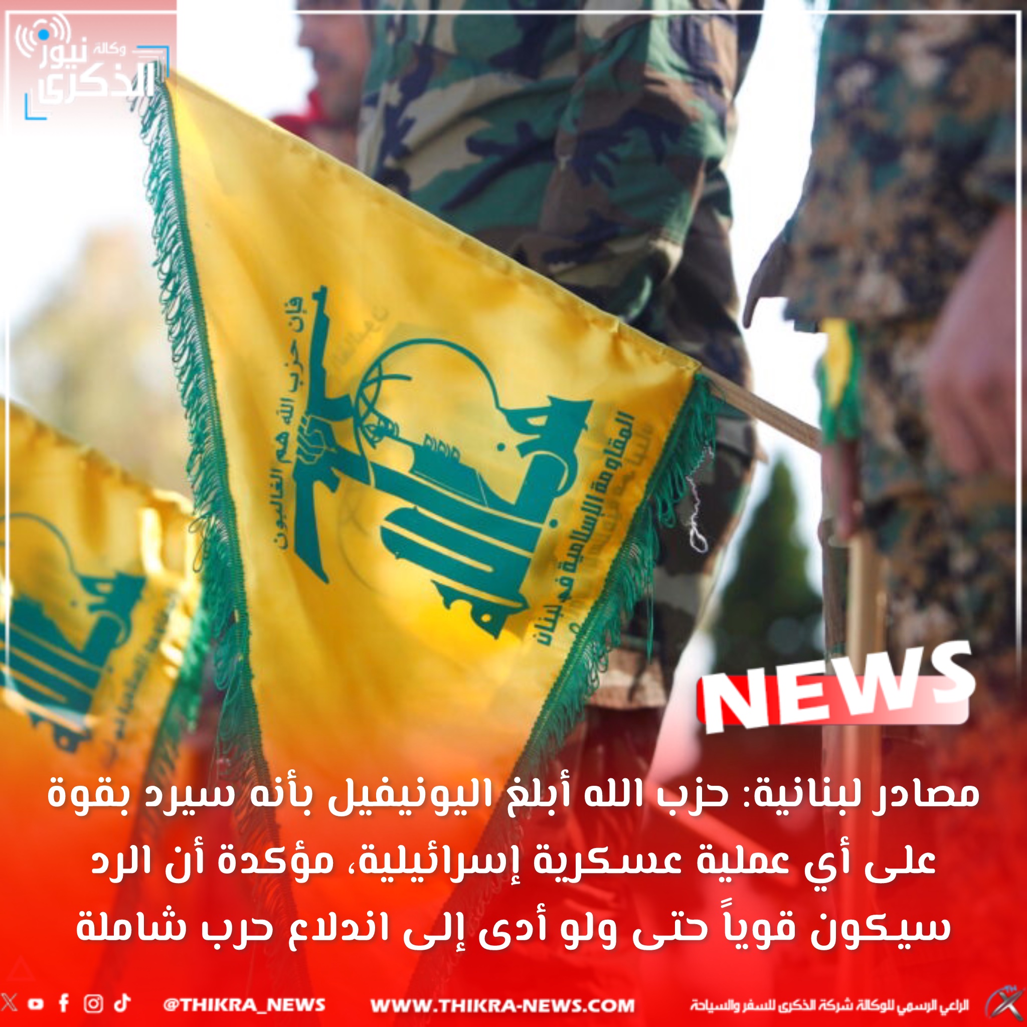 مصادر لبنانية: حزب الله أبلغ اليونيفيل بأنه سيرد بقوة على أي عملية عسكرية إسرائيلية، مؤكدة أن الرد سيكون قوياً حتى ولو أدى إلى اندلاع حرب شاملة