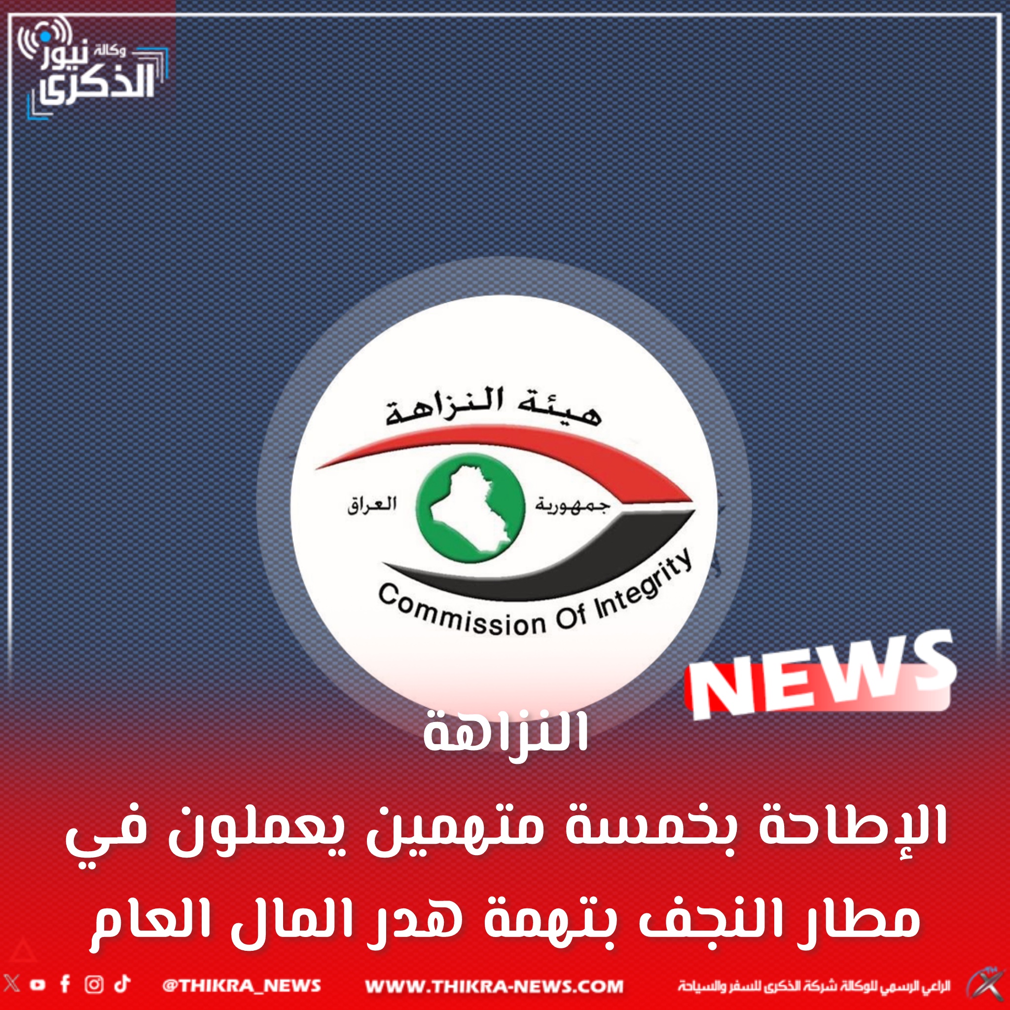 تمكَّنت هيئة النزاهة الاتحاديَّة من تنفيذ أمر القبض الصادر بحقّ خمسة مُتَّهمين في مطار النجف الدوليّ؛ بتهمة الهدر والإضرار بالمال العام.
