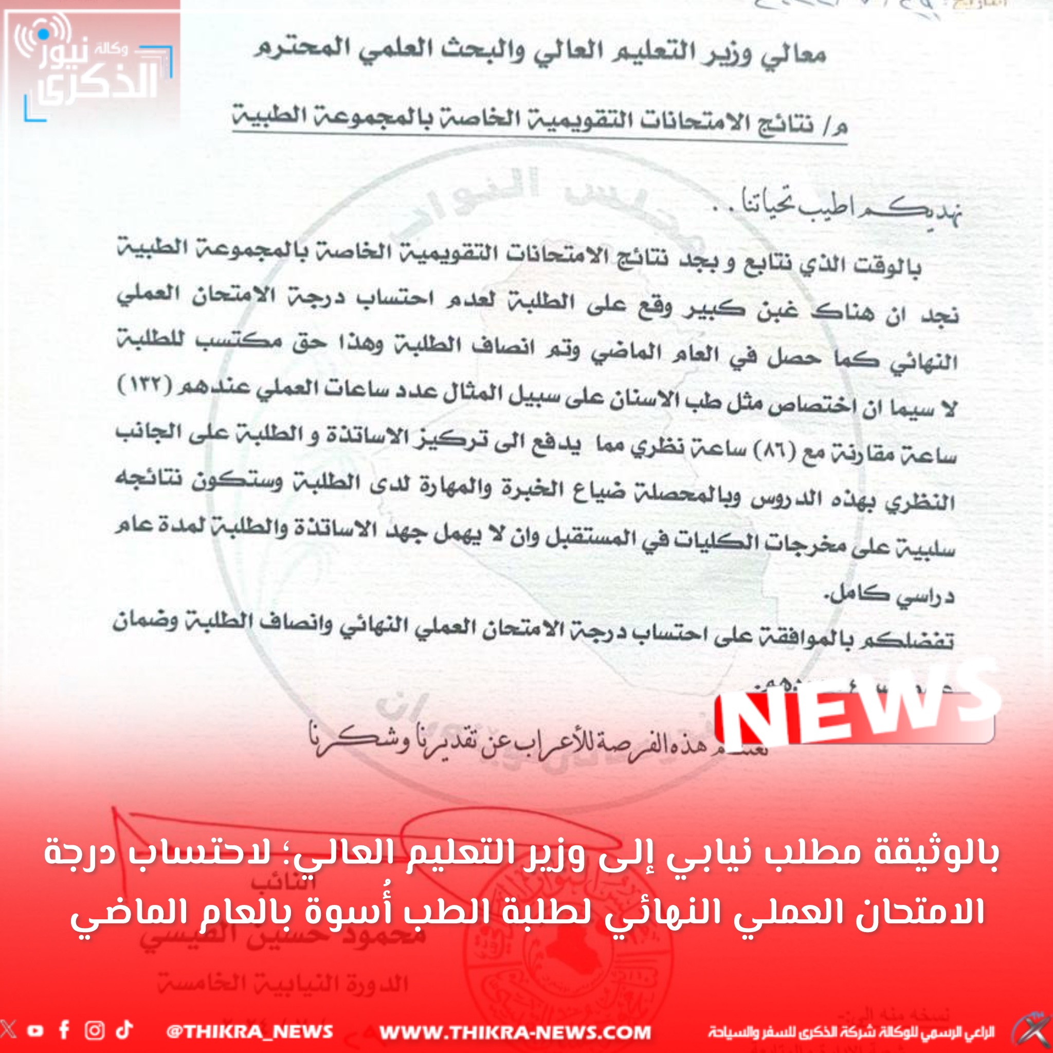 بالوثيقة مطلب نيابي إلى وزير التعليم العالي؛ لاحتساب درجة الامتحان العملي النهائي لطلبة الطب أُسوة بالعام الماضي