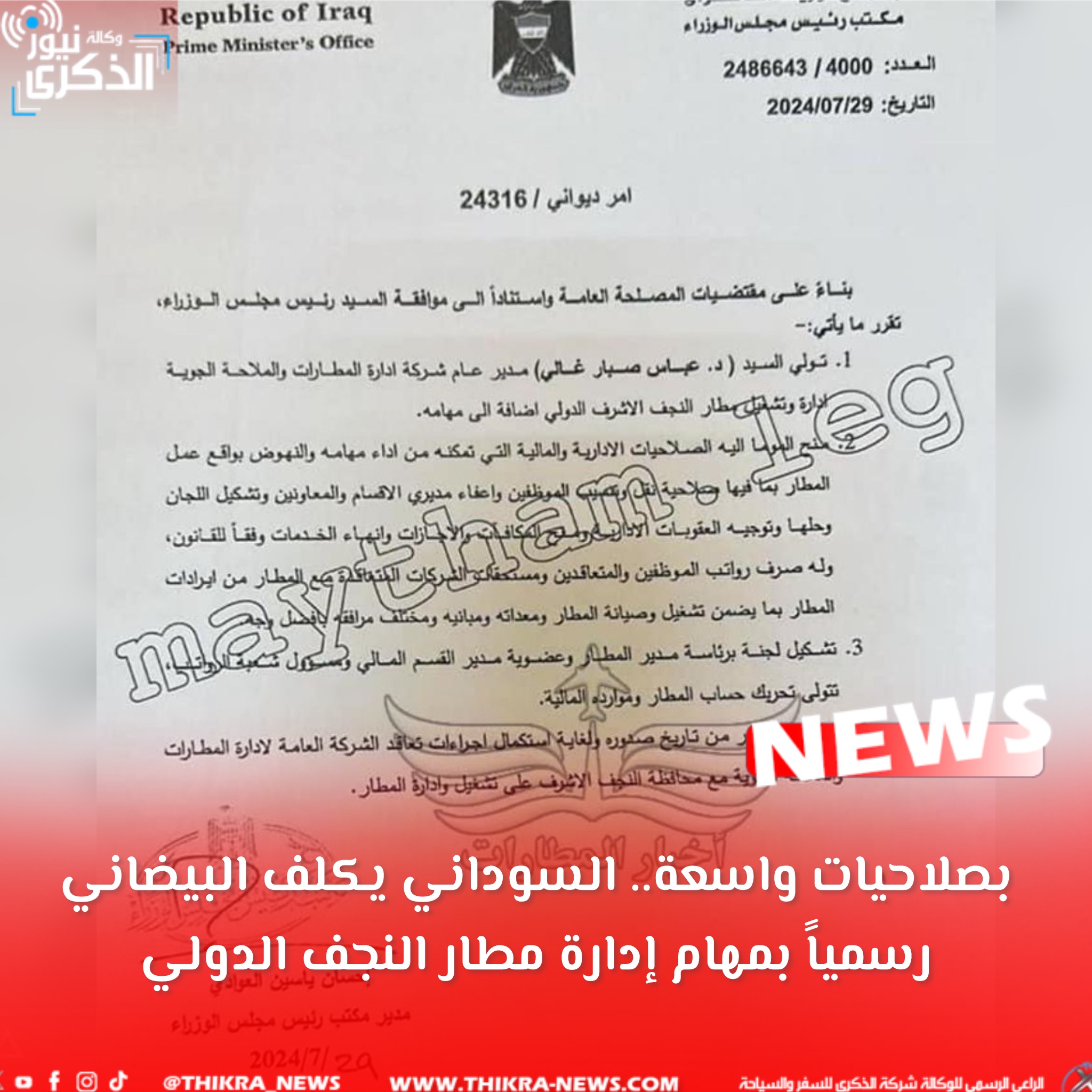 بصلاحيات واسعة.. السوداني يكلف البيضاني رسمياً بمهام إدارة مطار النجف الدولي