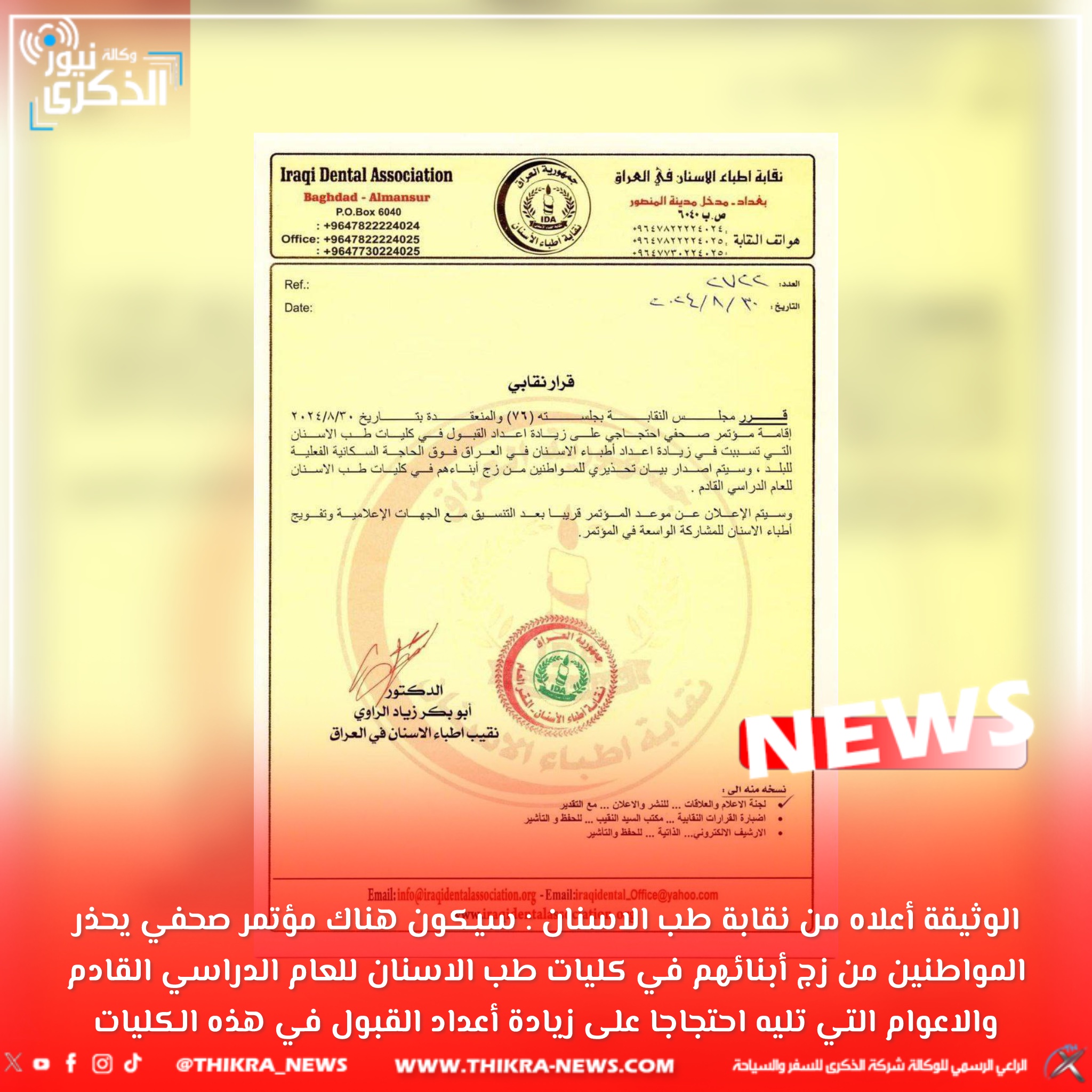 الوثيقة أعلاه من نقابة طب الاسنان : سيكون هناك مؤتمر صحفي يحذر المواطنين من زج أبنائهم في كليات طب الاسنان للعام الدراسي القادم والاعوام التي تليه احتجاجا على زيادة أعداد القبول في هذه الكليات