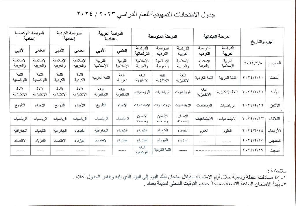 نشرت وزارة التربية، اليوم الاربعاء (7 شباط 2024)، جدول الامتحانات التمهيدية المقرر انطلاقها يوم غد الخميس.