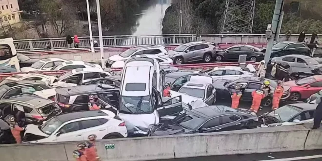 أصيب عدد من الأشخاص إثر اصطدام أكثر من 100 سيارة ببعضها البعض على جزء جليدي من طريق سريع في مدينة سوتشو الصينية، في حادث نجم عن الظروف الجوية القاسية.