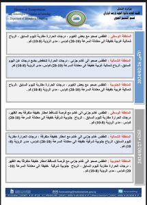 وذكرت الهيئة في بيان حصلت عليه ( الذكرى نيوز )، أن “حالة الطقس في المنطقة الوسطى سيكون الطقس غائم مع تشكل ضباب يزول تدريجيا ، درجات الحرارة ترتفع قليلا قياسا لليوم السابق والرياح شمالية غربية خفيفة الى معتدلة السرعة