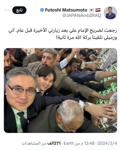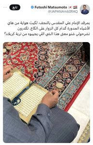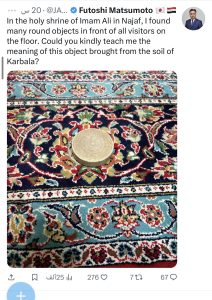 ثم عاد السفير الياياني بنشر تغريدة مع صورة تظهر وجود “تربة كربلاء” أمام زائر، حيث كتب، “في مرقد الإمام علي في النجف، وجدت العديد من الأشياء المستديرة أمام جميع الزوار على الأرض. هل يمكن أن تعلمني ما معنى هذه القطعة التي جلبت من تراب كربلاء؟”.
